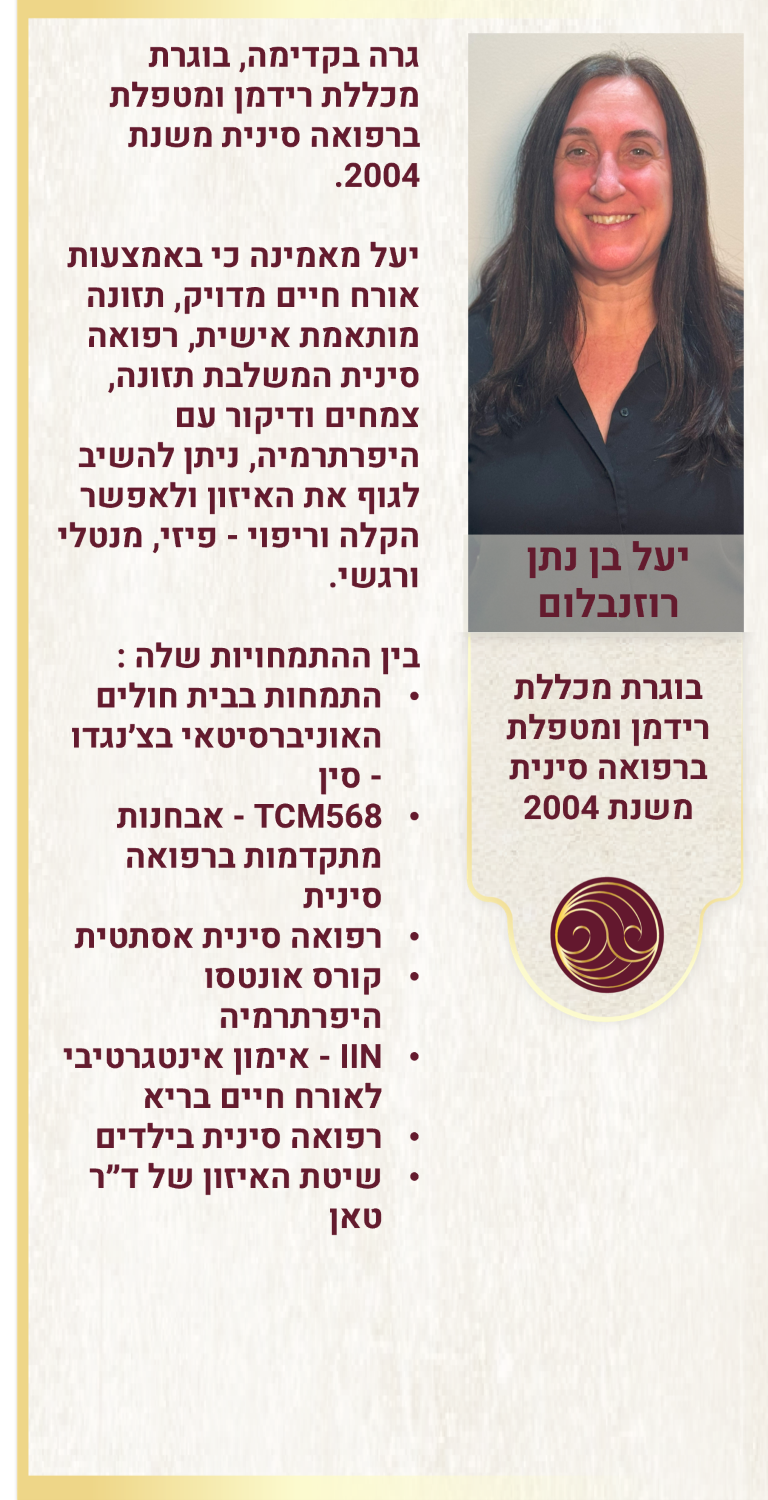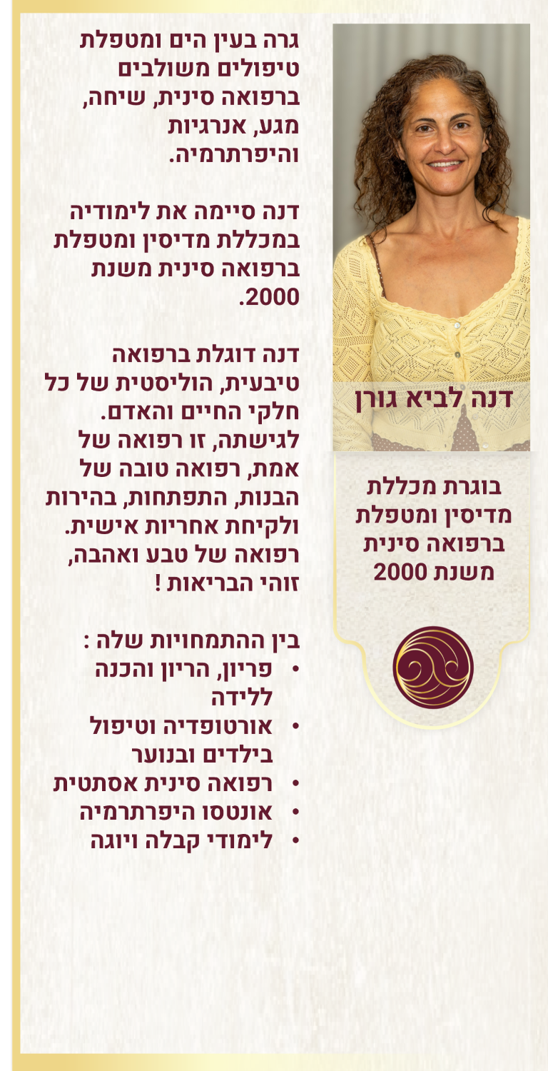עימה מטפלות 5 מטפלות ותיקות, מנוסות ומיומנות המשלבות טיפולים ברפואה סינית ויפנית עם טיפולים ברפואה אסתטית וטיפולי אונטסו היפרתרמיה בכל מגוון קשת הפתולוגיות, המחלות, הכאבים ושיפור איכות החיים, טיפולי שיאצו, טווינה, רפלקסולוגיה ועוד.